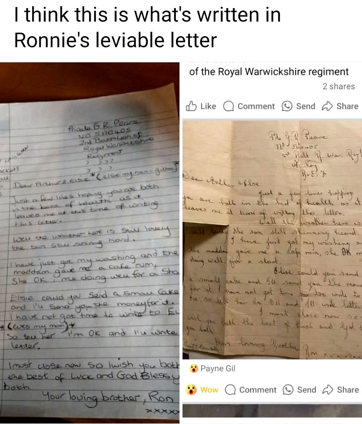 There are two letters, the one is so feint but talks about a time when they went out to the pub with Edie my nanny Pearce Elsie’s sister and that there was a black out ..the other letter fully legible talks about him asking Elsie my nan to send him a cake and he would send her the money.
